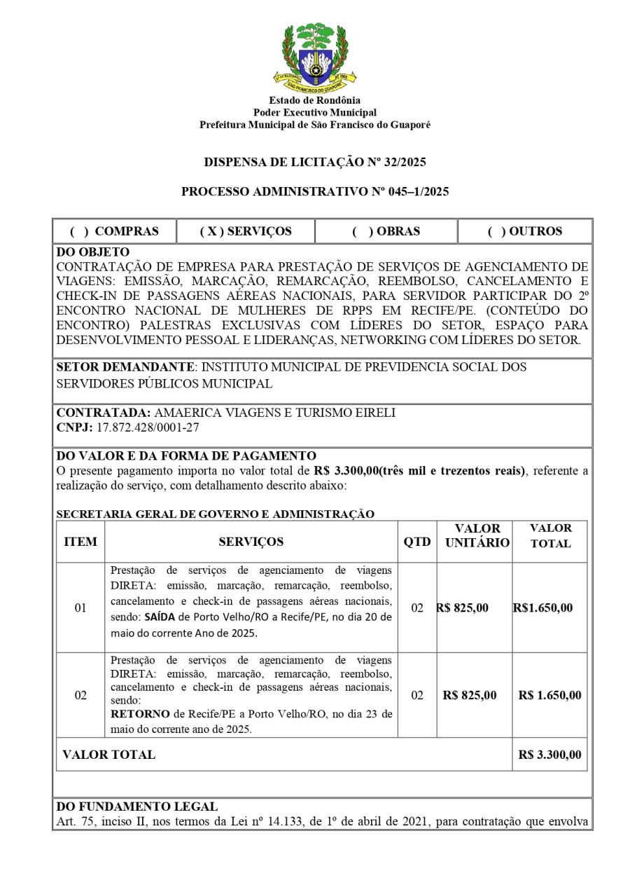 DISPENSA DE LICITAÇÃO Nº 32/2025 PROCESSO ADMINISTRATIVO Nº 045–1/2025