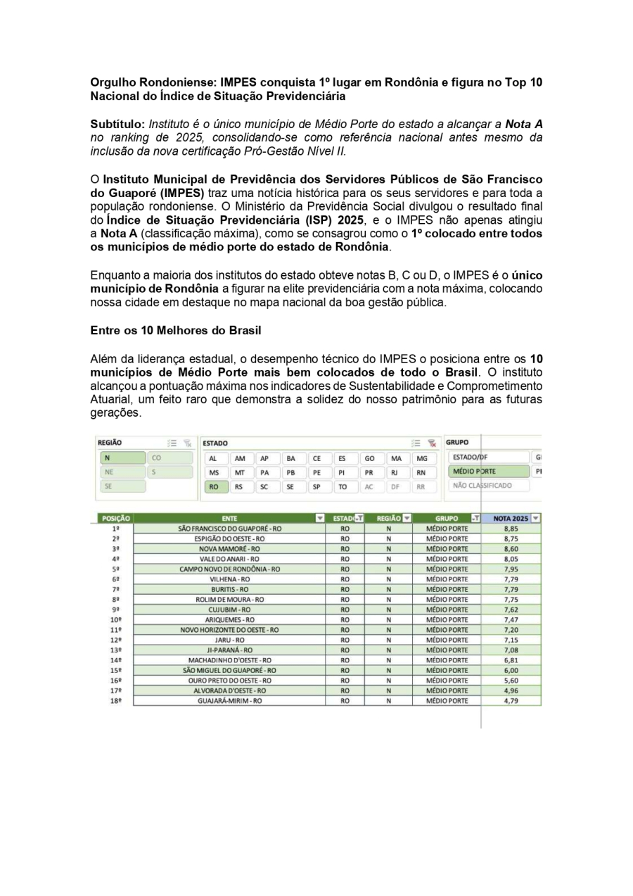 O Instituto Municipal de Previdência dos Servidores Públicos de São Francisco do Guaporé (IMPES) traz uma notícia histórica para os seus servidores e para toda a população rondoniense. O Ministério da Previdência Social divulgou o resultado final do Índice de Situação Previdenciária (ISP) 2025, e o IMPES não apenas atingiu a Nota A (classificação máxima), como se consagrou como o 1º colocado entre todos os municípios de médio porte do estado de Rondônia.